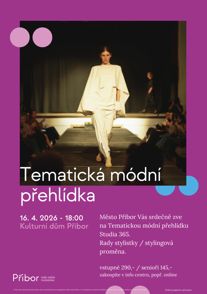 Město Příbor srdečně zve na Tematickou módní přehlídku, která se uskuteční 16. dubna 2026 od 18:00 v Kulturním domě Příbor. Akci pořádá Studio 365 a nabídne rady stylistky a stylingovou proměnu. Vstupné je 290 Kč, pro seniory 145 Kč. Vstupenky je možné zakoupit v informačním centru nebo online.