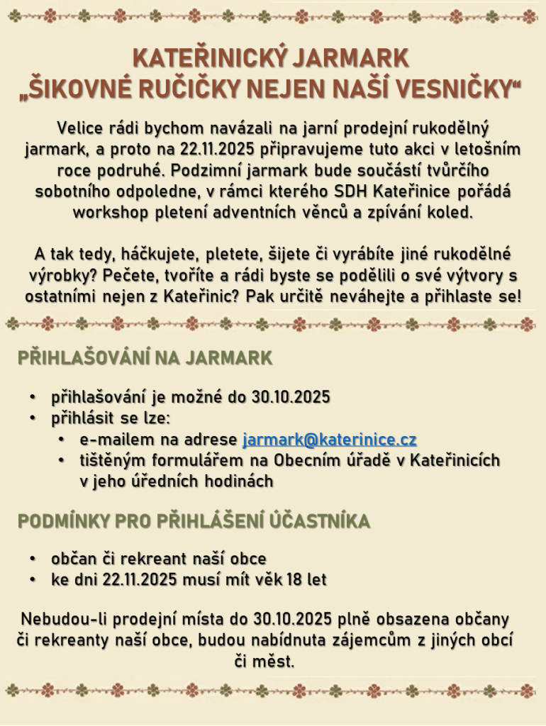 Sbor dobrovolných hasičů Kateřinice ve spolupráci s obcí Kateřinice si Vás dovoluje pozvat na Kateřinický jarmark s workshopem, který se uskuteční v sále Obecního domu Kateřinice v sobotu 22. listopadu 2025. Program této akce:
